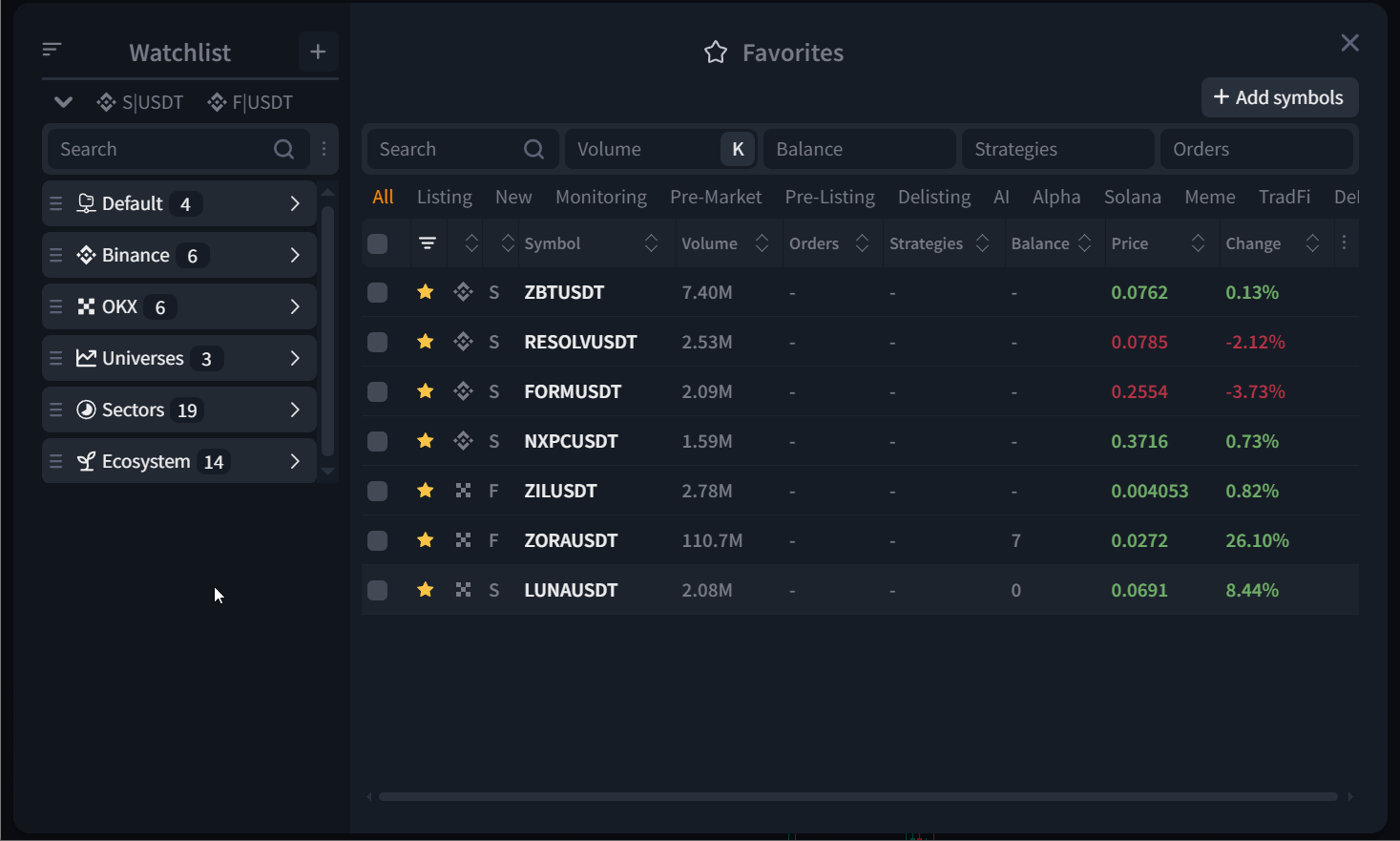 - filter by volume, balance availability, strategies and orders;